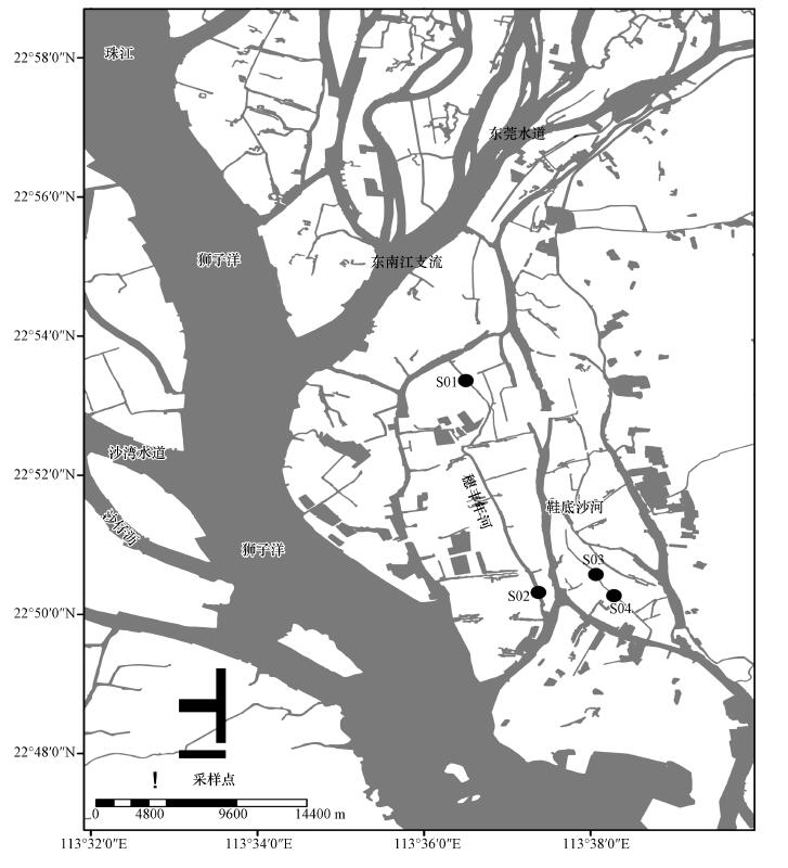 選擇珠三角地區(qū)東莞市典型黑臭河流穗豐年河和鞋底沙河,共設置4個采樣點(圖 1).現(xiàn)場測定上覆水的溶解氧(DO)、pH、氧化還原電位(ORP)、透明度,水樣用水樣采集器采集,帶回實驗室后分析總磷和氨氮的含量.表層沉積物用抓泥斗抓取表層20 cm的沉積物樣品,代表相對緩流的河流沉積物主要的生物活性層(Hickey,1988).沉積物樣品放置在自封袋中密封保存,防止樣品接觸空氣氧化與水分蒸發(fā).用自重力采樣器在各個樣點采集沉積物柱狀樣,樣品采集后冷藏保存并盡快運回實驗室分析.
