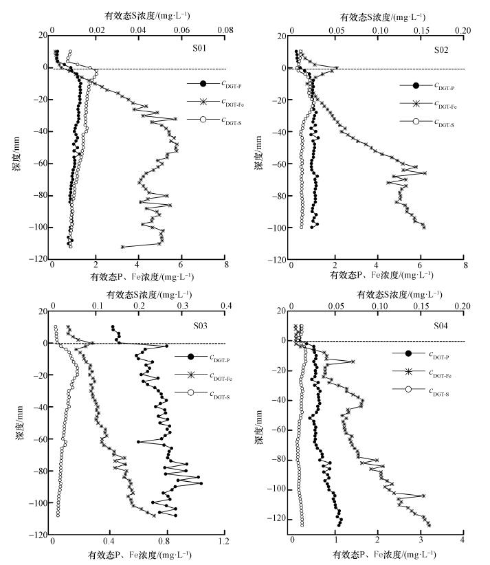 沉積物有效態(tài)P、Fe、S的剖面分布信息如圖 2所示.由圖可知,各點位的有效態(tài)濃度在局部深度存在凸起點,說明沉積物具有很強的空間異質(zhì)性.有效態(tài)P含量在沉積物-水界面以上濃度較小,且含量隨深度變化不大,在界面以下含量明顯增加,且各點位均在界面以下10 mm深度附近出現(xiàn)有效態(tài)P的峰值.峰值區(qū)域表明孔隙水中有效態(tài)P的濃度增加,或固相釋放有效態(tài)P的能力增強.S03和S04點位的有效態(tài)Fe與P、S的分布相似,而S01和S02點位的有效態(tài)Fe與P、S的分布布局有一定的差異,原因可能是投放時遇到較大顆粒的泥砂,導致ZrO-AgI DGT和Chelex DGT組合裝置背面沒有貼緊,插入沉積物時存在空間錯位,從而造成局部的異常.各點位有效態(tài)S的濃度均較低,且濃度剖面特征較為相似,在沉積物-水界面以下10 mm范圍內(nèi)濃度不斷升高,而后有所降低.高值區(qū)可能是由于存在較多的硫還原細菌,將硫酸鹽還原為可溶性硫.與其他研究結果相比,王艷平等(2015)和Han等(2015)利用DGT技術原位同步獲取了巢湖沉積物中有效態(tài)P、Fe和S的高分辨分布信息,本文獲得的有效態(tài)濃度值在合理范圍內(nèi),說明DGT技術應用于黑臭河流沉積物中也能得到較可靠的實驗結果,可在很大程度上滿足微界面研究的需要.