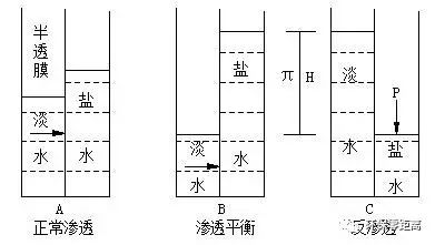 當(dāng)用一張只透水不透鹽的理想半透膜把純水和鹽水隔開,會觀察到純水透過半透膜而使鹽水側(cè)液位升高的現(xiàn)象(如下圖A所示),這種現(xiàn)象稱為滲透。達(dá)到平衡時,其高出的一段液柱H所產(chǎn)生的靜壓力稱為滲透壓π(如下圖B所示),其值隨半透膜鹽水側(cè)溶液中所含鹽的種類和濃度以及水溫而異。若鹽水側(cè)溶液中所含鹽的種類一定,其濃度和溫度越高,滲透壓π也越高.當(dāng)在鹽水側(cè)施加外界壓力P超過溶液的滲透壓π(P>π)時,鹽水中的水就會透過半透膜向純水一側(cè)流動,這說明可以從鹽水溶液中將水分離出來,由于這種現(xiàn)象是與滲透現(xiàn)象恰好相反,所以通稱為反滲透(如下圖所示):