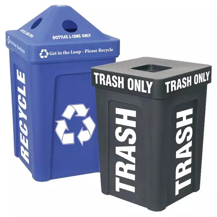 左邊為收集可回收垃圾的垃圾桶,右邊為收集家用生活垃圾的垃圾桶