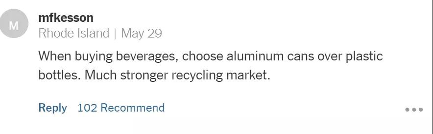 “當(dāng)我們買飲料時,應(yīng)該盡量買那些鋁制罐裝的而不是塑料的。鋁材質(zhì)有著更強大的回收市場?!?/p>