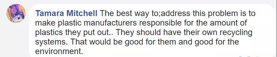 “解決這個問題最好的方式應(yīng)該是讓那些塑料制造商對他們生產(chǎn)的塑料負責(zé),他們應(yīng)該有自己的回收系統(tǒng),這對他們自己有利的同時也有益于我們的環(huán)境。”