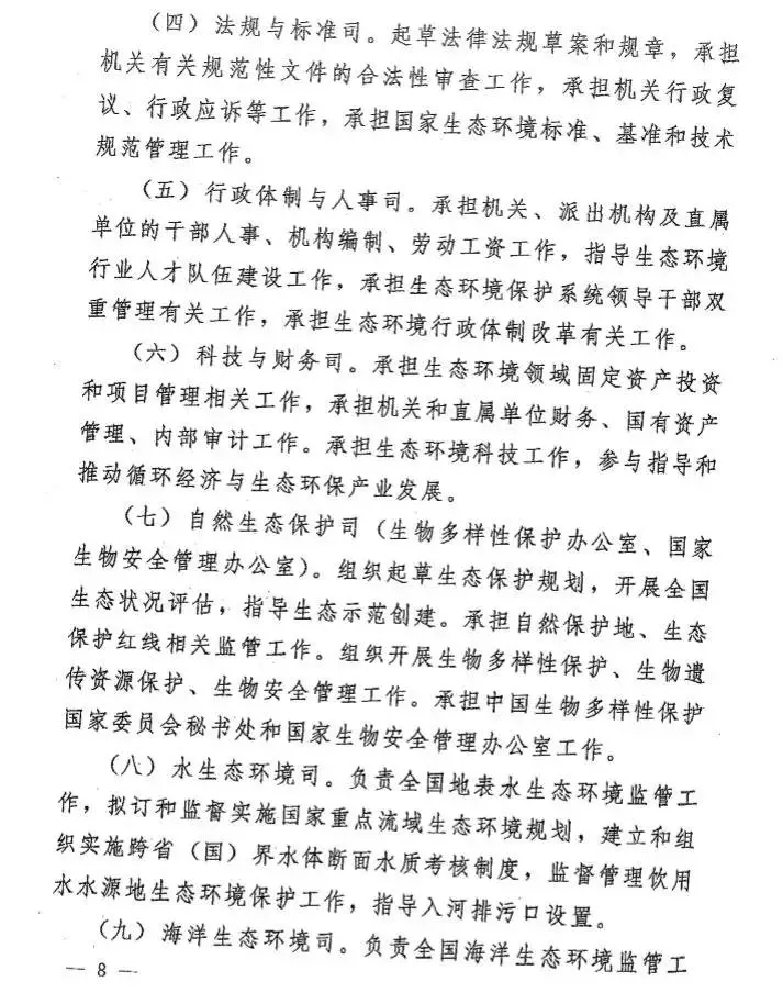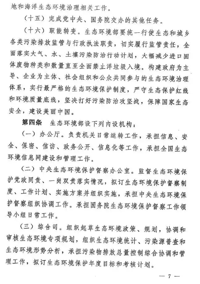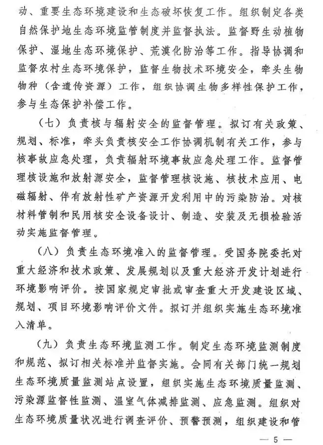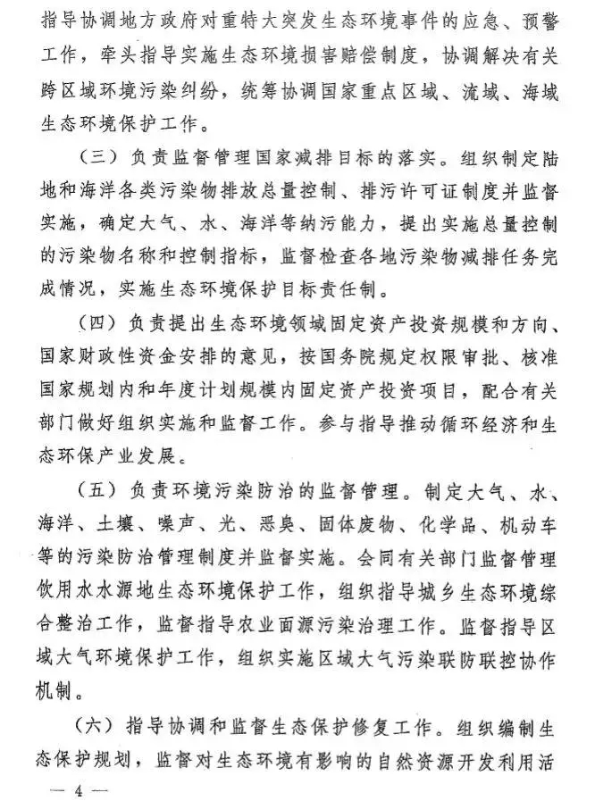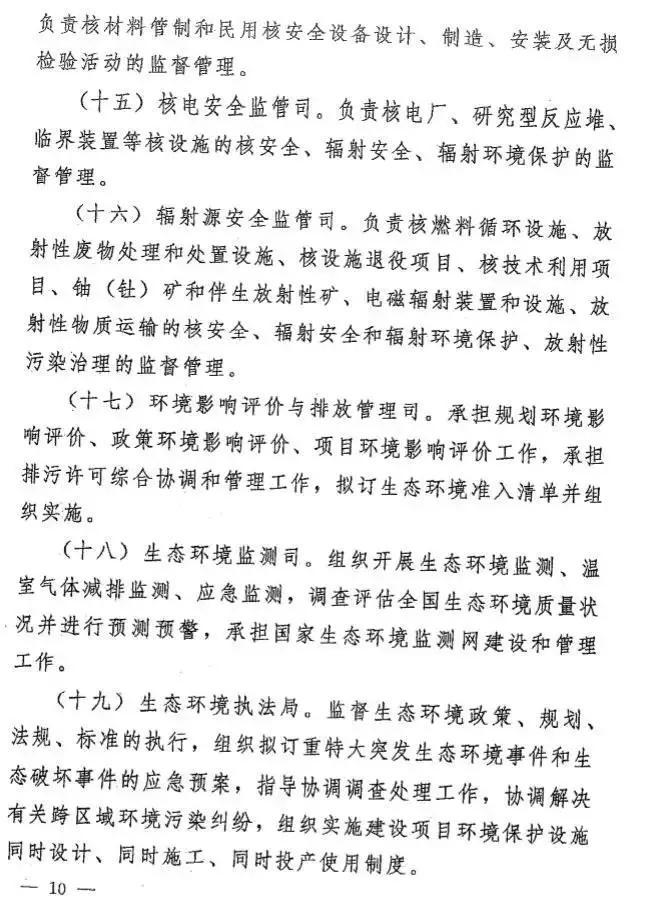 根據(jù)今年國(guó)務(wù)院機(jī)構(gòu)改革方案,生態(tài)環(huán)境部負(fù)責(zé)建立健全生態(tài)環(huán)境基本制度,負(fù)責(zé)重大生態(tài)環(huán)境問(wèn)題的統(tǒng)籌協(xié)調(diào)和監(jiān)督管理,負(fù)責(zé)提出生態(tài)環(huán)境領(lǐng)域固定資產(chǎn)投資規(guī)模和方向、國(guó)家財(cái)政性資金安排的意見(jiàn),以及負(fù)責(zé)環(huán)境污染防治的監(jiān)督管理、生態(tài)環(huán)境準(zhǔn)入的監(jiān)督管理、生態(tài)環(huán)境監(jiān)測(cè)、生態(tài)環(huán)境監(jiān)督執(zhí)法等。