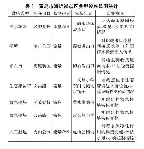 根據(jù)住建部出臺(tái)的《海綿城市建設(shè)典型設(shè)施設(shè)計(jì)參數(shù)與監(jiān)測效果要求》,需要對生態(tài)滯留設(shè)施、植草溝、CSO調(diào)蓄池、干塘、濕塘、人工濕地和綠色屋頂進(jìn)行在線監(jiān)測。根據(jù)典型設(shè)施的構(gòu)造和主要效果進(jìn)行在線監(jiān)測指標(biāo)的篩選:對于以水量控制為主的設(shè)施,需在線監(jiān)測水量情況,其中調(diào)蓄池和雨水桶具有穩(wěn)定液面,可進(jìn)行液位監(jiān)測;對于水質(zhì)具有明顯凈化效果的設(shè)施則應(yīng)進(jìn)行SS的在線監(jiān)測。青島市海綿試點(diǎn)區(qū)典型設(shè)施監(jiān)測情況如表1所示。