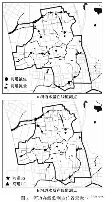 在水量監(jiān)測方面,各河道源頭均位于試點(diǎn)區(qū)內(nèi),在距源頭200m左右的位置進(jìn)行液位在線監(jiān)測,沿途中間段布設(shè)液位計(jì)以監(jiān)測水位變化;試點(diǎn)區(qū)出口及支流匯入處布設(shè)流量監(jiān)測。水質(zhì)監(jiān)測方面,為對流經(jīng)試點(diǎn)區(qū)部分進(jìn)行水環(huán)境質(zhì)量的綜合評價(jià),在每條河道試點(diǎn)區(qū)范圍內(nèi)上下游各布置1臺(tái)在線SS監(jiān)測儀,河道中下游位置布設(shè)在線DO監(jiān)測儀,對河道整體的黑臭情況進(jìn)行反映。河道在線監(jiān)測布點(diǎn)如圖3所示。