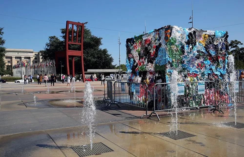 配圖:工作組會議期間,日內(nèi)瓦萬國宮外的塑料垃圾“立方”,提醒人們塑料垃圾問題的嚴重性。