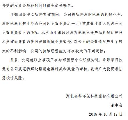 10月17日,金科環(huán)保發(fā)布公告稱,公司主營業(yè)務廢舊電器拆解業(yè)務因未通過2018 年第二批次廢棄電器電子產(chǎn)品拆解處理技術復核,已暫停工作,該業(yè)務營收約占公司主營業(yè)務營收的70%,預計將對金科環(huán)保的經(jīng)營情況產(chǎn)生較大的不利影響。