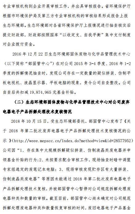 公告顯示,金科環(huán)保廢舊電器拆解業(yè)務未通過審核的原因在于:1、存在集中大規(guī)模拆解疑似拼裝、仿制液晶類廢電器并申領基金補貼的行為;2、未按要求配合審核工作,現(xiàn)場抽查時暗中調筐專家組選定的廢筆記本電腦;3、現(xiàn)場審核發(fā)現(xiàn)貯存區(qū)有大量拼裝、仿制液晶類廢電器。