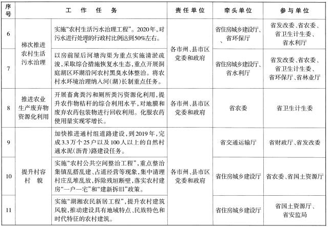 (一)加強組織領導。各級黨委和政府要把農(nóng)村人居環(huán)境整治作為實施鄉(xiāng)村振興戰(zhàn)略的重要任務。省農(nóng)委具體負責工作協(xié)調(diào)、組織推動和督導考核,負責農(nóng)業(yè)生產(chǎn)廢棄物污染治理和村容村貌提升等工作。省財政廳要根據(jù)農(nóng)村人居環(huán)境整治任務的資金需求,做好資金籌措工作。省發(fā)改委要做好項目統(tǒng)籌,爭取中央預算內(nèi)資金支持。省住房城鄉(xiāng)建設廳負責農(nóng)村生活垃圾污水治理、農(nóng)村廁所革命、農(nóng)村黑臭水體整治和農(nóng)房建設管理等工作。省水利廳負責清淤疏浚等工作。省環(huán)保廳負責農(nóng)村環(huán)境綜合整治全省域覆蓋工作。省交通運輸廳負責農(nóng)村道路建設工作。其他相關部門參照國家部委有關工作職責分工,做好全省農(nóng)村人居環(huán)境整治相關工作的落實推進。市州黨委和政府做好上下銜接、域內(nèi)協(xié)調(diào)和督促檢查工作??h級黨委和政府是農(nóng)村人居環(huán)境整治的責任主體,黨政主要負責同志負主體責任,要做好項目落地、資金使用、推進實施等工作,對實施效果負責。鄉(xiāng)鎮(zhèn)黨委和政府要做好具體組織實施工作。村委會、作業(yè)區(qū)(生產(chǎn)隊)負責動員黨員干部和村民完善村規(guī)民約,發(fā)動群眾投工投勞開展農(nóng)村人居環(huán)境整治。