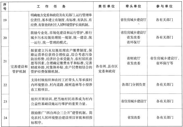 (七)持續(xù)完善建設和管護機制。明確地方黨委和政府及有關部門、運行管理單位責任,基本建立有制度、有標準、有隊伍、有經(jīng)費、有督查的村莊人居環(huán)境管護長效機制。結合美麗鄉(xiāng)村建設、易地扶貧搬遷、農(nóng)村危房改造、農(nóng)村環(huán)境綜合整治和農(nóng)業(yè)、林業(yè)、水利到村項目統(tǒng)籌實施農(nóng)村人居環(huán)境整治。按照政府主導、分級負擔,集體補充、群眾參與,社會支持、多元籌集原則,合理確定政府、村集體和農(nóng)戶出資責任,并承擔相應建設和管護職責。對污水垃圾集中處理、無害化衛(wèi)生公廁等農(nóng)村衛(wèi)生公共服務設施的建設管護主要由政府出資;對戶用廁所改造、戶用小型污水處理等設施建設,由農(nóng)戶適當出資、政府給予獎補,日常管護以農(nóng)戶為主;村莊綠化、美化、亮化及道路硬化等建設,由村集體、農(nóng)戶適當出資,村民投工投勞,政府給予獎補,日常管護以村集體為主。配備村莊保潔員,建立村莊日常保潔制度,建立運行監(jiān)督和激勵機制。各縣市區(qū)應將農(nóng)村人居環(huán)境整治年度工作經(jīng)費和設施建設運行費用納入財政預算管理。鼓勵專業(yè)化、市場化建設和運行管護,推行城鄉(xiāng)垃圾污水處理統(tǒng)一規(guī)劃、統(tǒng)一建設、統(tǒng)一運行、統(tǒng)一管理的模式。探索建立垃圾污水處理農(nóng)戶付費制度,保障運營單位獲得合理收益,綜合考慮污染防治形勢、經(jīng)濟社會承受能力、農(nóng)村居民意愿等因素,合理確定繳費水平和標準,完善財政補助、村集體補貼、農(nóng)戶付費相結合的管護經(jīng)費保障機制。實施“農(nóng)村建筑工匠培育工程”,開展建筑工匠培訓,探索建立建房建筑工匠驗收制度和公示制度。支持村級組織和農(nóng)村工匠帶頭人等承接村內(nèi)環(huán)境整治、村內(nèi)道路、植樹造林等小型涉農(nóng)工程項目。組織開展培訓,把當?shù)卮迕衽囵B(yǎng)成為村內(nèi)公益性基礎設施運行維護的重要力量。鼓勵推廣“四自兩會三公開” (自選、自建、自管、自用,村委會、理事會,項目選擇公開、理事會選舉公開、工程建成后財務公開)建管機制。簡化農(nóng)村人居環(huán)境整治建設項目審批和招投標程序,降低建設成本,確保工程質(zhì)量。