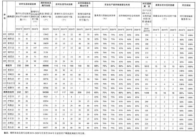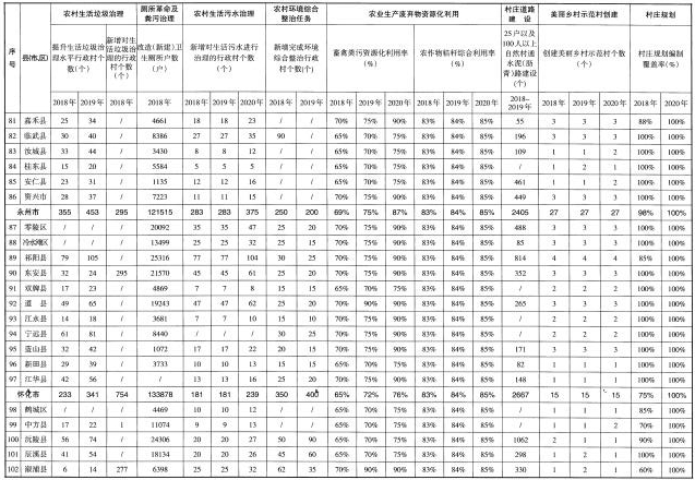 (三)工作目標。到2020年,基本建成與全面小康社會相適應的農(nóng)村垃圾污水、衛(wèi)生廁所、村容村貌治理體系,實現(xiàn)農(nóng)村人居環(huán)境明顯改善,村莊環(huán)境基本干凈整潔有序,農(nóng)民環(huán)境與健康意識普遍增強。實現(xiàn)村莊規(guī)劃編制全覆蓋;化肥農(nóng)藥使用量實現(xiàn)零增長;90%的村莊生活垃圾得到治理并基本建立日常保潔機制;85%的農(nóng)戶用上衛(wèi)生廁所,生活污水亂排亂放得到管控;25戶以及100人以上的自然村通水泥(瀝青)路,村內(nèi)主要道路基本硬化。