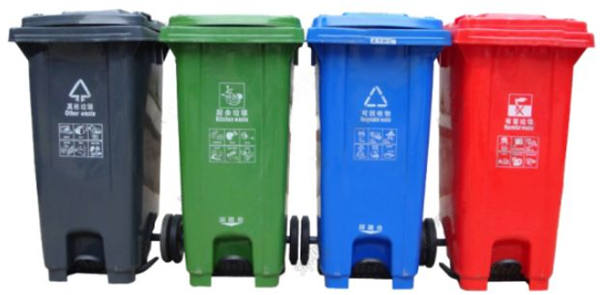 (其他垃圾:灰色,餐廚垃圾:綠色,可回收物:藍(lán)色,有害垃圾:紅色,鼓勵使用帶腳踏收集容器,方便市民投放)