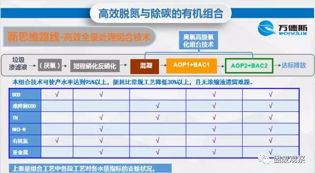 南京萬(wàn)德斯環(huán)??萍脊煞萦邢薰旧虾7止究偨?jīng)理陳建湧介紹,在滲瀝液脫碳技術(shù)上,萬(wàn)德斯環(huán)保采用“厭氧+高效生化+納濾+臭氧高級(jí)氧化AOP(Advanced Oxidation Process)” 為主的工藝,在高效脫氮中,利用短程硝化技術(shù),節(jié)省供氧量25%、節(jié)省反硝化碳源40%、減少污泥生成量50%、減少投堿量、縮短反應(yīng)時(shí)間。在滲瀝液高效全量處理中,組合利用 “厭氧+短程硝化反硝化+臭氧高級(jí)氧化(混凝+AOP1+BAC1+AOP2+BAC2)”技術(shù),能使產(chǎn)水率達(dá)到95%以上,且無(wú)濃縮液遺留難題。除技術(shù)創(chuàng)新外,陳建湧總經(jīng)理認(rèn)為,提倡垃圾干濕分類(lèi),采取各種有效措施減少各種好水分包括雨水進(jìn)入垃圾,以及垃圾堆場(chǎng)等,對(duì)降低滲瀝液處理成本具有非常重要的意義。