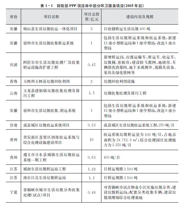 2015年開始,PPP模式在各地公用市政行業(yè)全面展開,業(yè)內(nèi)人士稱之為PPP元年。伴隨整個(gè)市場(chǎng)大環(huán)境,環(huán)衛(wèi)服務(wù)行業(yè)的市場(chǎng)化也已經(jīng)大幕開啟,越來(lái)越多的環(huán)衛(wèi)領(lǐng)域的項(xiàng)目開始公開招標(biāo)。各地開始出現(xiàn)一些分包作業(yè)或者環(huán)衛(wèi)一體化PPP項(xiàng)目,包含垃圾清運(yùn)、道路清掃、設(shè)施維護(hù)等環(huán)衛(wèi)作業(yè)內(nèi)容,或打包招標(biāo)。較為典型的是2015年海口市環(huán)衛(wèi)一體化建設(shè)全面引入PPP模式項(xiàng)目,4個(gè)區(qū)分別由北京環(huán)衛(wèi)集團(tuán)、龍馬環(huán)衛(wèi)和深圳玉禾田公司中標(biāo)。2015年財(cái)政部建立的PPP項(xiàng)目庫(kù)中首次出現(xiàn)了17個(gè)環(huán)衛(wèi)項(xiàng)目,總規(guī)模約42億元,主要以垃圾清運(yùn)項(xiàng)目為主。截至目前通過(guò)2015年財(cái)政部建立的PPP項(xiàng)目庫(kù)檢索生活垃圾相關(guān)的PPP項(xiàng)目,有多達(dá)202條項(xiàng)目記錄,包含生活垃圾清運(yùn)、轉(zhuǎn)運(yùn)、分揀、終端處理設(shè)施新建和改擴(kuò)建等項(xiàng)目。