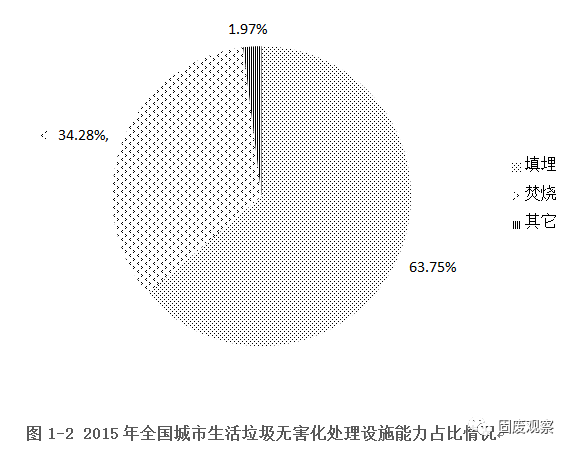 2015年全國(guó)城市生活垃圾無(wú)害化處理設(shè)施達(dá)到890座,無(wú)害化處理量為18013.01萬(wàn)噸,比上一年分別增長(zhǎng)8.8%和9.88%。衛(wèi)生填埋、焚燒依舊是我國(guó)采用的垃圾無(wú)害化處理兩種主要方式。其中,衛(wèi)生填埋640座,比上一年增加36座,無(wú)害化年處理量為11483.14萬(wàn)噸,比上一年增加6.88%。生活垃圾焚燒廠220座,比上一年增加32座,無(wú)害化年處理量為6175.52萬(wàn)噸,比上一年大幅增加15.87%。其他類型處理設(shè)施30座,比上一年增添4座,無(wú)害化年處理量為354.35萬(wàn)噸,比2014年增加10.88%。填埋、焚燒分別占總無(wú)害化處理量的63.74%、34.28%,“十二五”期間,填埋處理總量比例持續(xù)小幅下降,焚燒廠數(shù)量和處理能力持續(xù)保持明顯上升,其他類型處理方式一直未有突破性發(fā)展。