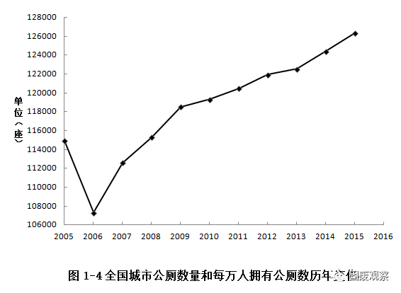 2015年全國(guó)城市公共廁所數(shù)量共有126344座,其中三類以上廁所93541座,比2014年分別增長(zhǎng)1.5%和0.49%;三類以上公共廁所占全部公共廁所數(shù)量比例由2014年74.83%略微減少至74.04%。目前公廁數(shù)量最多的省份為江蘇、廣東、浙江、河南、黑龍江、河北、上海、山東、北京、遼寧等省。