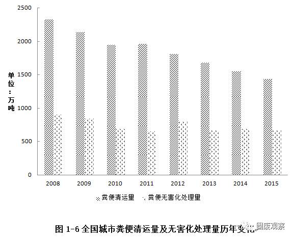 2015年全國(guó)城市共清運(yùn)糞便1436.77萬(wàn)噸,無(wú)害化處理量673.67萬(wàn)噸,無(wú)害化處理率為46.89%。清運(yùn)量較2014年繼續(xù)保持下降,但無(wú)害化處理率繼續(xù)保持上升,較上一年增加2.30%。