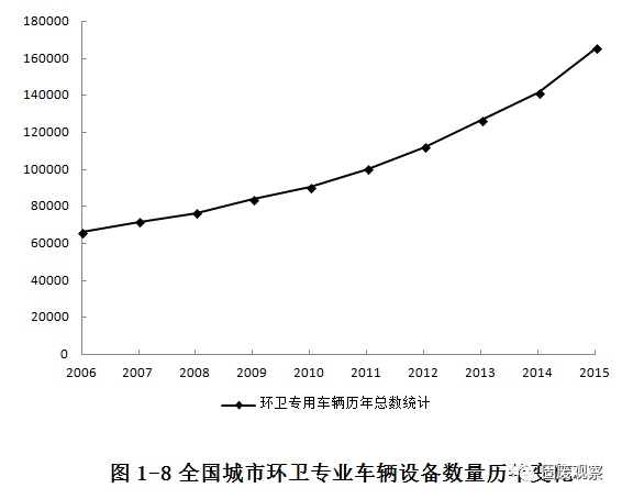 2015年全國(guó)城市環(huán)衛(wèi)專用車輛設(shè)備總數(shù)達(dá)到165725臺(tái)(輛),比2014年增加24294臺(tái)(輛),增長(zhǎng)率達(dá)到17.18%。2006至2015年的10年期間,環(huán)衛(wèi)專用車輛總數(shù)平均年增長(zhǎng)率達(dá)到8.51%,持續(xù)保持高速增長(zhǎng)。