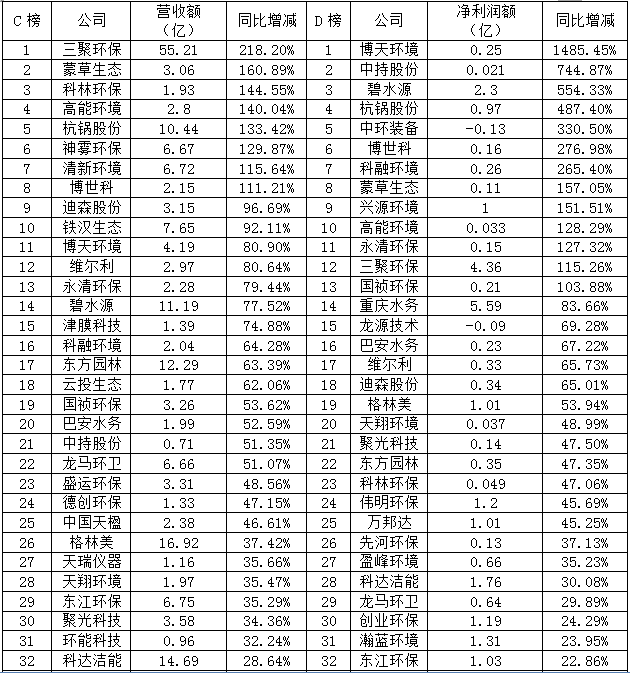 2017年多數(shù)環(huán)保上市企業(yè)一季度報(bào)告顯示贏得開門紅,同期均有所增長,僅四家表示營業(yè)收入同期下降。不過凈利潤7家為虧損狀態(tài), 15家同期下降。以下A榜為營業(yè)收入排行榜,B榜為凈利潤排行榜。C榜為營業(yè)收入同比增長率排行榜,D榜為凈利潤同比增長率排行榜。