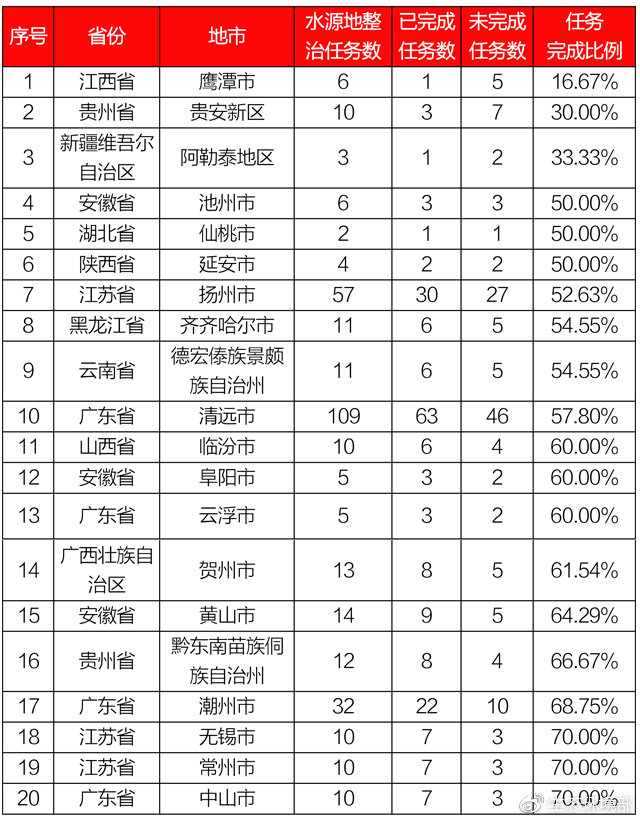 水源地環(huán)境問(wèn)題整治進(jìn)展后20位地市