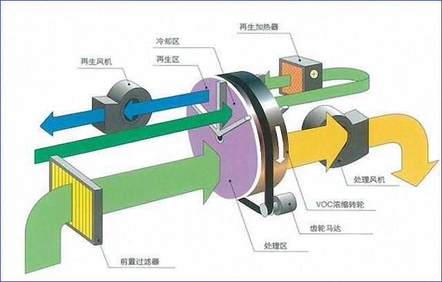 RTO系統(tǒng)的核心組成部分——沸石輪轉濃縮機(RC),可以分為處理區(qū)、再生區(qū)、冷卻區(qū)。含有VOC的被處理空氣通過過濾器后,送到濃縮轉輪的處理區(qū),VOC被吸附除去;吸附于濃縮轉輪的凈化后的空氣在再生區(qū)經(jīng)熱風處理被脫附濃縮;濃縮轉卻在冷卻區(qū)被冷卻,經(jīng)過冷卻后的空氣,再經(jīng)加熱后作為再生空氣使用。