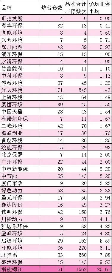 文章導讀本文根據(jù)行業(yè)知名度、業(yè)務體量、業(yè)務涉及地域。選取了36個在垃圾焚燒行業(yè)里已經(jīng)具有品牌知名度的品牌企業(yè)。橫向?qū)Ρ冗@些品牌企業(yè)的非計劃停爐、在線故障和計劃內(nèi)停爐工況情況。36家品牌企業(yè)分別為——北京保羅、北控系 、川能動力 、高能環(huán)境、光大環(huán)境、廣州環(huán)投、海螺創(chuàng)業(yè)、海諾爾環(huán)保、瀚藍環(huán)境、康恒環(huán)境...