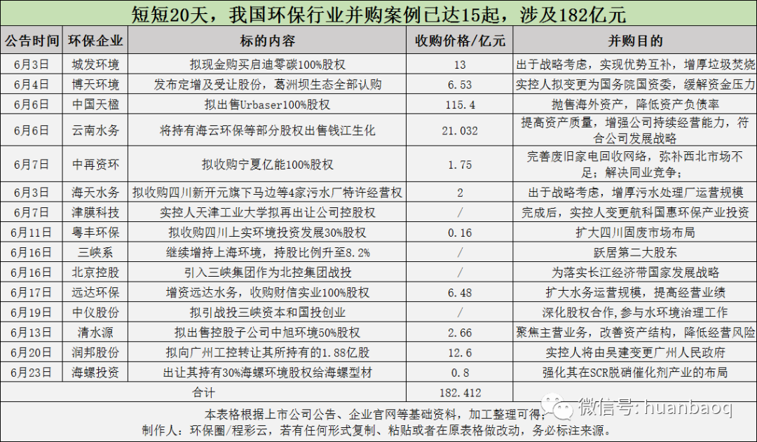 0120天15起收并購交易資金近200億元首先,從數(shù)量和金額上,今年上半年我國環(huán)保產(chǎn)業(yè)收并購活動比往年愈發(fā)猛烈,其數(shù)量之多和金額之大也刷新了歷史紀錄,創(chuàng)下了近年來之最(詳細數(shù)據(jù)見文末)。僅在剛剛過去的20天里(6月3日-6月23日),據(jù)筆者不完全統(tǒng)計,我國環(huán)保行業(yè)收并購案例就高達15起,粗略估算交易...