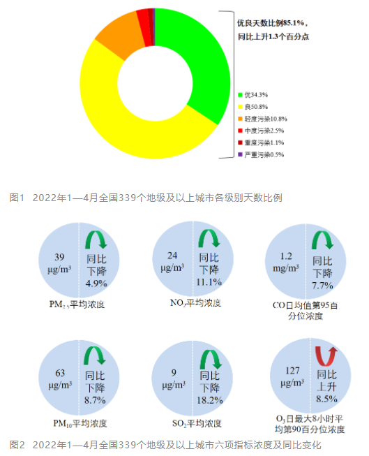 生態(tài)環(huán)境部5月18日向媒體通報了2022年4月和1—4月全國環(huán)境空氣質(zhì)量狀況。 環(huán)境空氣總體情況 4月,全國339個地級及以上城市平均空氣質(zhì)量優(yōu)良天數(shù)比例為89.0%,同比下降3.5個百分點;PM2.5平均濃度為28微克/立方米,同比持平;PM10平均濃度為56微克/立方米,同比上升3....