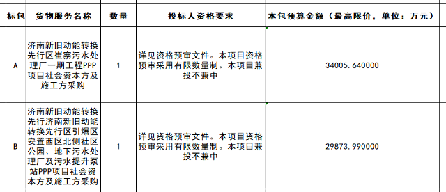 近日,中國政府采購網(wǎng)發(fā)布山東省濟(jì)南市先行區(qū)污水處理廠PPP項目社會資本方及施工方采購資格預(yù)審公告,采購項目共2個,A標(biāo)包為濟(jì)南新舊動能轉(zhuǎn)換先行區(qū)崔寨污水處理廠一期工程PPP項目社會資本方及施工方采購,預(yù)算金額34005.64萬元,B標(biāo)包為濟(jì)南新舊動能轉(zhuǎn)換先行濟(jì)南新舊動能轉(zhuǎn)換先行區(qū)引爆區(qū)安置西區(qū)北側(cè)社...