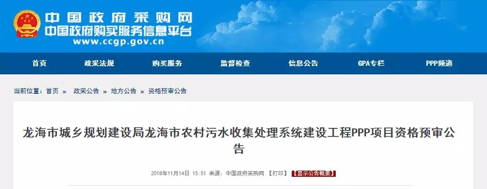 11月14日,中國水網(wǎng)從中國政府采購網(wǎng)獲悉,龍海市農(nóng)村污水收集處理系統(tǒng)建設(shè)工程PPP項目發(fā)布資格預(yù)審公告,總投資為211836.86 萬元。 項目建設(shè)內(nèi)容及規(guī)模: 合同包一:龍海市農(nóng)村污水收集處理系統(tǒng)建設(shè)工程(榜山鎮(zhèn)、海澄鎮(zhèn)、東園鎮(zhèn)、紫泥鎮(zhèn))PPP項目(項目總投資金額為118400.1萬元) 包括榜...