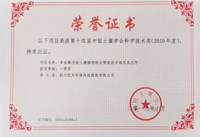 2019年10月,經(jīng)中國土壤學會項目評選委員會評審決定,航天凱天環(huán)??萍脊煞萦邢薰九c中山大學、廣東省耕地肥料總站聯(lián)合申報的“多金屬污染土壤植物聯(lián)合修復技術體系及應用”獲中國土壤學會科學技術獎一等獎。 該技術體系將航天凱天環(huán)保自主研發(fā)的重金屬土壤修復技與中山大學研發(fā)的多金屬污...