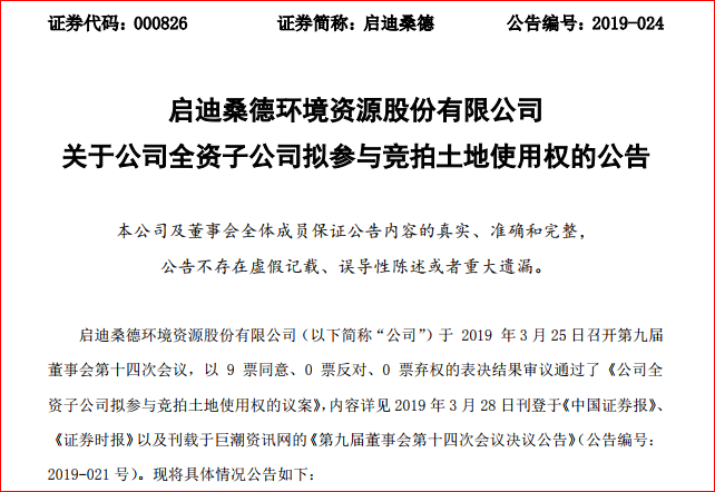 2019年3月28日,啟迪桑德環(huán)境資源股份有限公司(下文簡稱“啟迪桑德”)發(fā)布公告,公司全資子公司宜昌桑德置業(yè)有限公司為滿足未來業(yè)務發(fā)展及辦公需要,擬以自有或自籌資金參與競拍宜昌市自然資源和規(guī)劃局以掛牌方式出讓宜土網(2019)9 號地塊的國有建設用地使用權。 公告顯示,地塊...