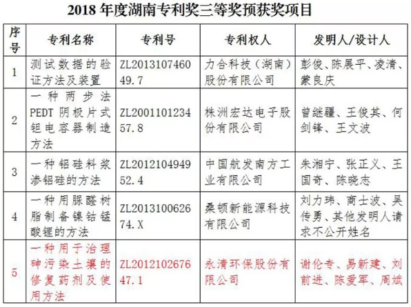 近日,湖南省專利局公示2018年度湖南專利獎評審結(jié)果,永清環(huán)保發(fā)明專利《一種用于治理砷污染土壤的修復藥劑及使用方法》(專利號:ZL201210267647.1)獲湖南省專利獎三等獎。 本發(fā)明的目的在于克服現(xiàn)有技術(shù)的不足,創(chuàng)新提供一種原料來源廣泛、制備簡單、操作使用方便、效率高、治理效果好的,用于治理...