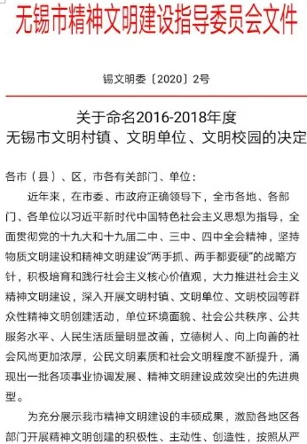近日,根據(jù)無(wú)錫市精神文明建設(shè)指導(dǎo)委員會(huì)下發(fā)文件錫文明委〔2020〕2號(hào)《關(guān)于命名2016—2018年度無(wú)錫市文明村鎮(zhèn)、文明單位、文明校園的決定》,華光股份、市政設(shè)計(jì)院、友聯(lián)熱電被授予 2016-2018年度“無(wú)錫市文明單位”稱號(hào)。 近年來(lái),華光股份在無(wú)錫市文明辦等...