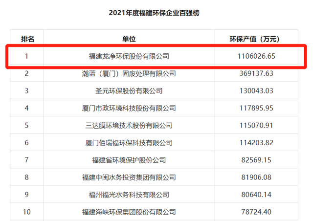 2022年6月6日,福建環(huán)保產(chǎn)業(yè)協(xié)會(huì)發(fā)布2021年度福建環(huán)保企業(yè)百強(qiáng)榜名單,龍凈再次榮登百強(qiáng)榜榜首,是全省唯一一家營收超過百億的環(huán)保企業(yè)。 據(jù)悉,福建環(huán)保企業(yè)百強(qiáng)榜是基于2021年度全國環(huán)保產(chǎn)業(yè)重點(diǎn)企業(yè)基本情況調(diào)查產(chǎn)生的,是以各單位當(dāng)年環(huán)保產(chǎn)值為主要依據(jù)。龍凈2021年年報(bào)顯示,營業(yè)收入113億元,...
