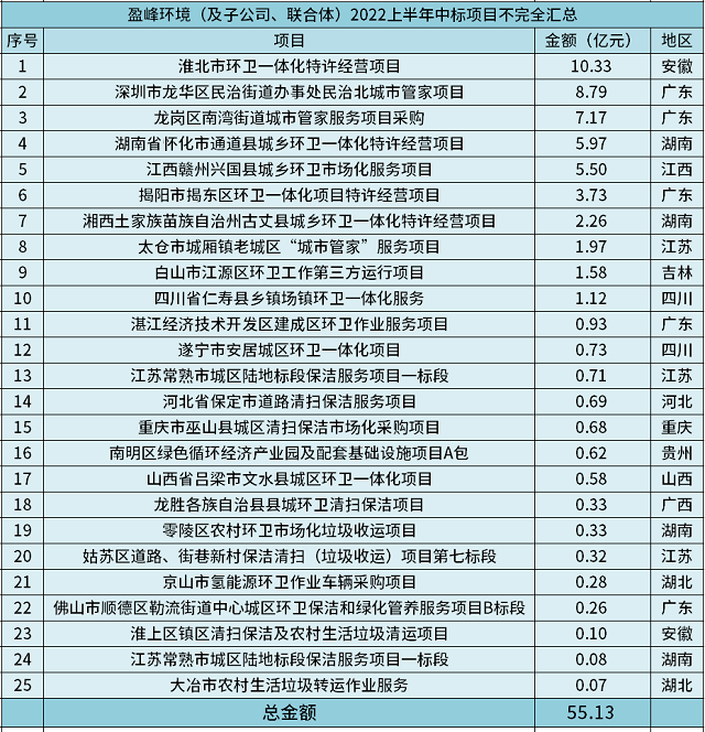 2022年上半年,國內(nèi)環(huán)衛(wèi)市場依舊風(fēng)云變幻。既頻頻掉落10億級(jí)項(xiàng)目,又有環(huán)衛(wèi)與物業(yè)的新老玩家之爭,更有40進(jìn)1、16進(jìn)1、10進(jìn)1等“奪標(biāo)戰(zhàn)”引關(guān)注。而就在激烈的交鋒中,盈峰環(huán)境作為作為頭部環(huán)衛(wèi)企業(yè)之一,亦有著搶眼表現(xiàn)。 據(jù)環(huán)保在線不完全統(tǒng)計(jì),截至6月底,盈峰環(huán)境中標(biāo)二十余個(gè)...
