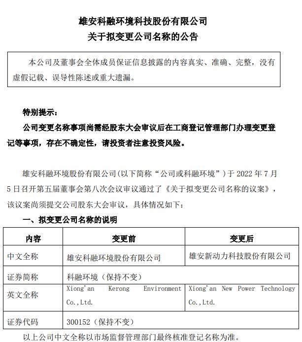 2022年7月5日,雄安科融環(huán)境科技股份有限公司發(fā)布《關(guān)于擬變更公司名稱的公告》。 科融環(huán)境擬更名為“雄安新動(dòng)力科技股份有限公司”,證券簡稱不變,證券代碼不變。(公司中文全稱以市場監(jiān)督管理部門最終核準(zhǔn)登記名稱為準(zhǔn)) 科融環(huán)境表示,更名原因在于公司自2010年IPO以來,業(yè)務(wù)從...